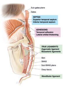 Facelift surgery involves lifting and repositioning different facial layers affected by aging and gravity. The key structure addressed in most effective facelifts is the SMAS layer — a deeper tissue layer responsible for supporting the facial soft tissues. The SMAS layer is normally anchored to the skull bone and deeper structures through retaining ligaments making them fixed and limits their repositioning during a facelift.